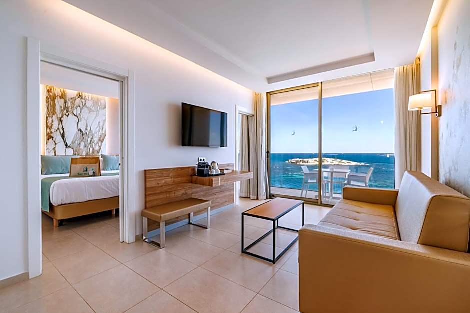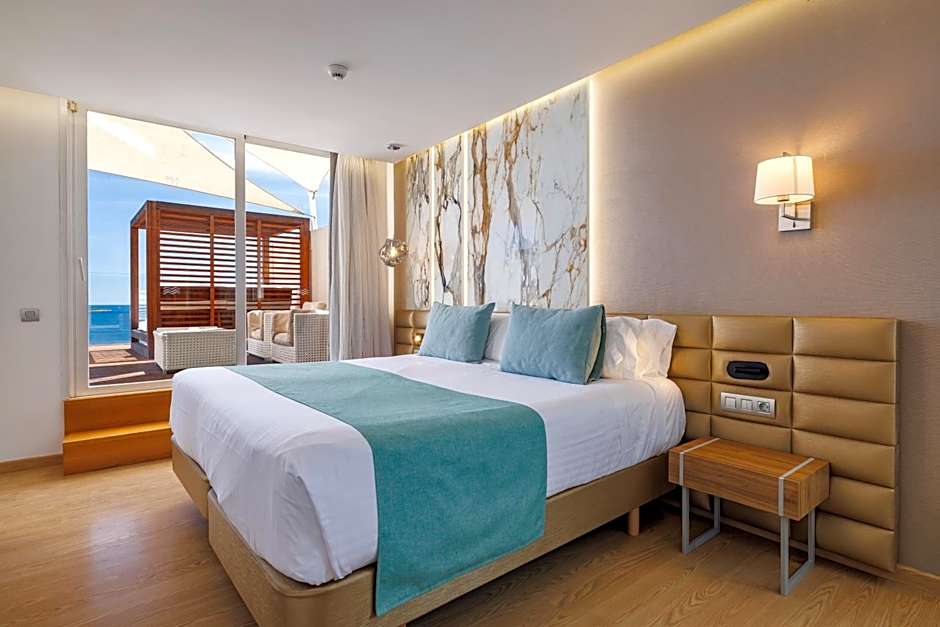 Luxuriously appointed suite with 148 ft² terrace with outdoor hot tub and sun beds.